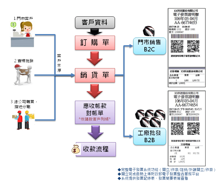 坤成有工廠批發及門市銷售,並且導入方圓進銷存、電子發票系統,輕鬆掌握每筆訂單之出貨狀況並可於銷售時開立電子發票,工廠大量批發給各經銷商開立B2B電子發票,門市則開立對象為消費者的B2C電子發票,並透過方圓加值中心定時上傳至財政部電子發票整合服務平台中心,以利整合電子發票。