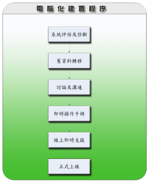 電腦化建置程序&技術特色 一、電腦化建置程序: 系統事先仔細評估與了解原有資料整理及移轉使用者的認知與溝通,流程討論標準化的輔導流程及教育訓練完整的輔導手冊,為企業電腦化記錄完整SOP。專屬的輔導人員與企業負責窗口,均能快速協助企業導入上線。 二.技術特色